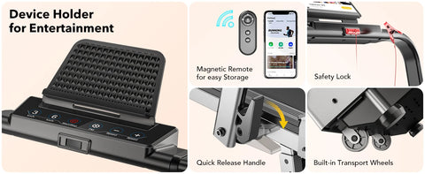 Contenu du paquet : Tapis de course1, support smartphone1, clé de sécurité1, télécommande1 (pile bouton1), carte de garantie1, manuel d’instruction1, kit d’outils (clé M51)